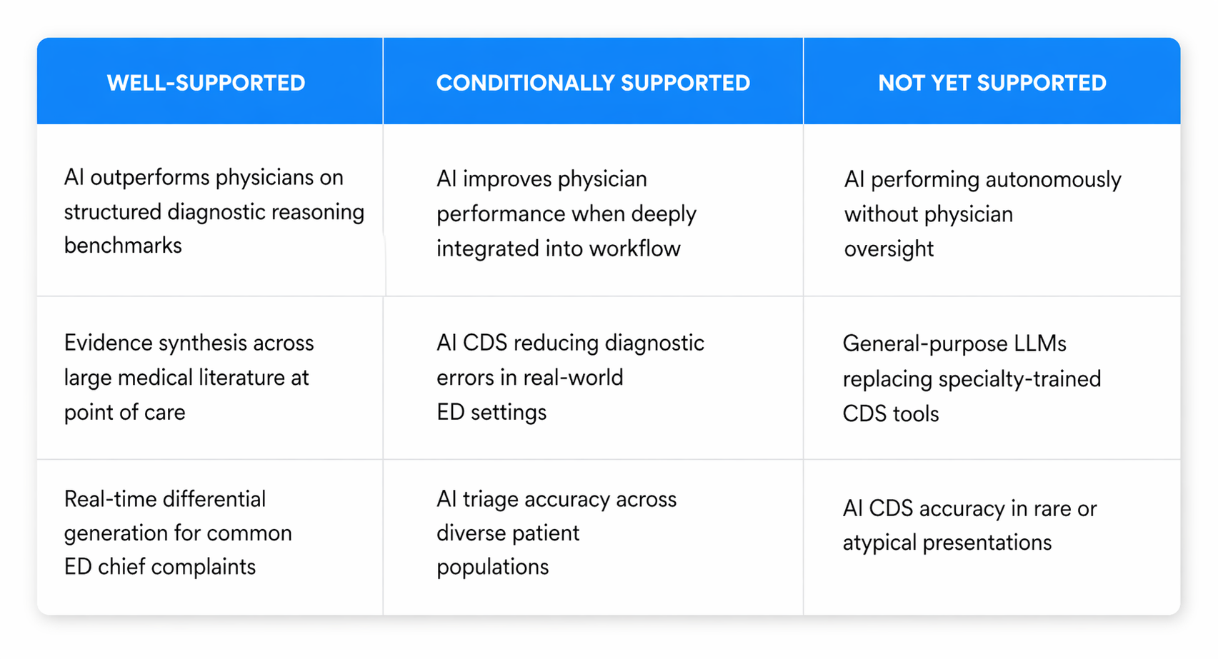 Most of the limitations the research identifies in AI CDS tools trace back to a common design failure: tools built for general clinical environments and applied to emergency medicine without the specialty-specific architecture the evidence says matters.