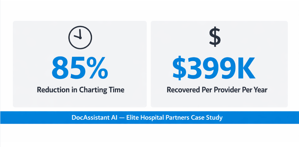 That integration is precisely what drove the outcomes at Elite Hospital Partners. Across providers in the study, DocAssistant AI delivered an 85% reduction in charting time and recovered an average of $399,000 per provider per year in previously lost revenue. Revenue that had been there in the clinical record all along, just not captured at the appropriate coding level.