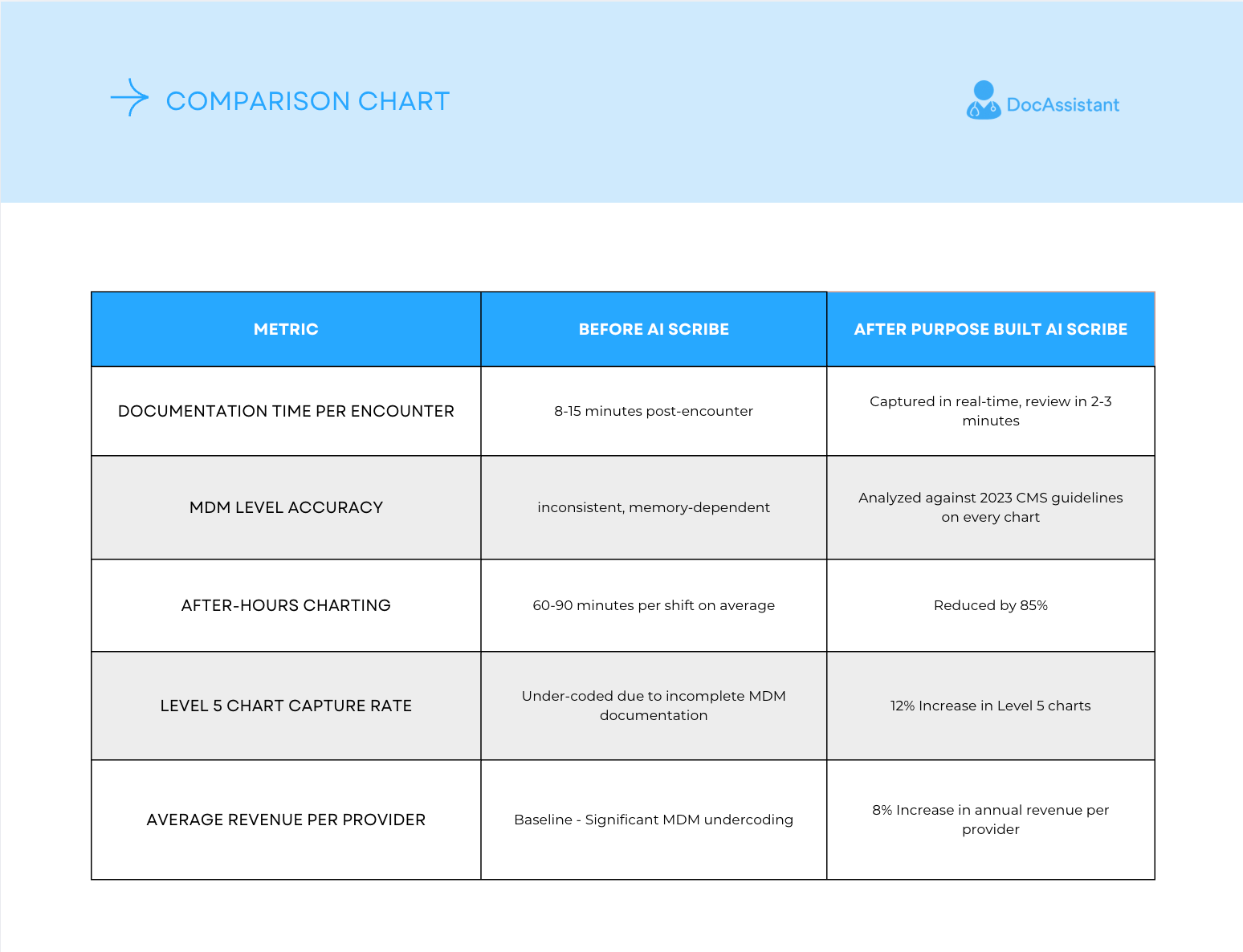 The most useful way to present this data is as a direct before/after comparison across the metrics that matter most to an ED revenue cycle team. The following composite represents what the research and real-world implementations consistently show across emergency departments that have adopted purpose-built AI scribing with integrated MDM billing analysis.
