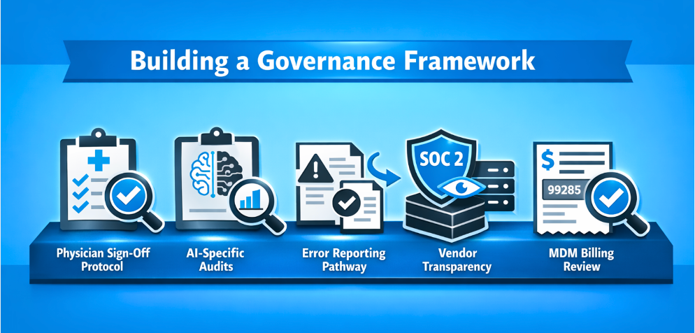 This is the core practical section. Five components that any emergency department deploying AI documentation should have in place - not as bureaucratic compliance overhead, but as operational infrastructure that catches problems before they become liabilities.
